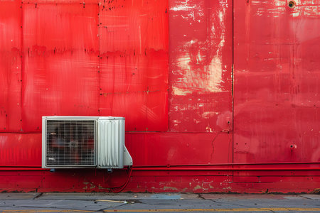 Old air conditioner is keeping a weathered red wall cool in the summer heat