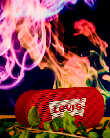 Bankura, West Bengal, India - September 24, 2022: Levi's Bluetooth speaker with FM radio place in front of colorful smoke motion background played on computer monitor studio photography.