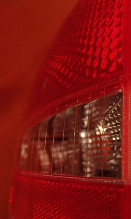 A closeup view of a red car grille featuring shiny vertical slats as part of a vintage automobile design
