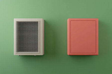 Minimalist home interior design featuring retro heating units on a green wall, showcasing modern style and color contrast in home decor
