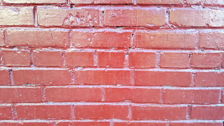bloody red broken bricks on very old brickwall with coral light red lines between bricks as background. Colorful brick wall pattern, painted bricks as urban texture