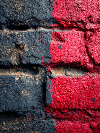 A detailed view of a weathered brick surface, vividly splashed with bold black and red strokes, highlighting its rough texture and artistic appeal.