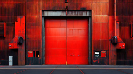 A striking image of a bold red industrial door set against a textured metal wall, highlighting urban design and architectural elements with vivid color contrasts.