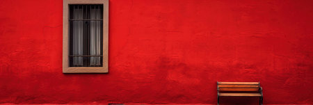 Wide banner of red wall, minimalistic decoration, bench and window