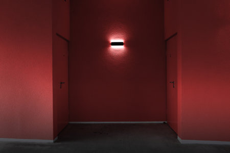 Red door with light in the dark room.