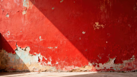 Weathered architectural detail showing rough bright red stucco surface texture with cracks and damage illuminated by high contrast directional lighting.