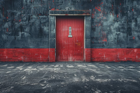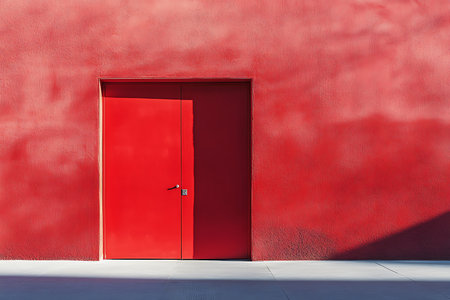 Features a vibrant red door flush against a textured red wall with subtle light play. Adds visual interest with its minimalist architectural design.