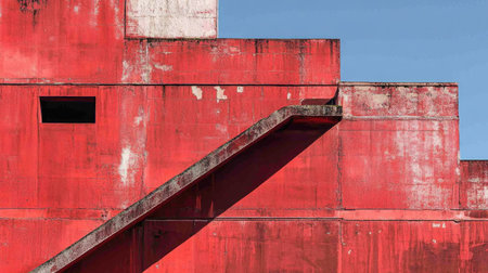 This striking abstract image features a bold red wall with geometric shapes, showcasing urban architecture and modern design elements in a captivating way.