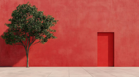 A vibrant red wall contrasts with a single green tree beside a bright door, showcasing minimalist urban aesthetics and visual simplicity. Perfect for modern design themes.