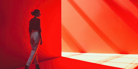 This is a captivating play of vibrant red shadows and luminous light, creating a striking abstract visual effect