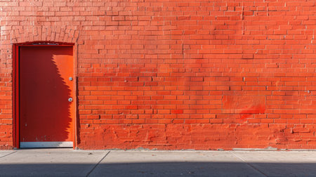 Vibrant Red Brick Wall with a Bright Red Door on a Sunny Day. Concept of Urban Architecture, Color Contrast, City Streets, Simplicity, Exit, Entrance. Copy space.