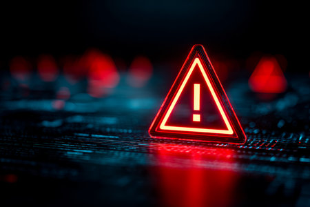 A vibrant illuminated symbol featuring a bold exclamation point casts an energetic glow against a shadowy backdrop, signaling caution with striking vi