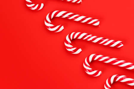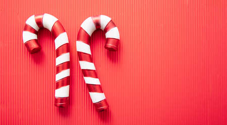 Merry Christmas. Xmas Candy canes on red background. Peppermint red white striped traditional kids candies, top view, copy space