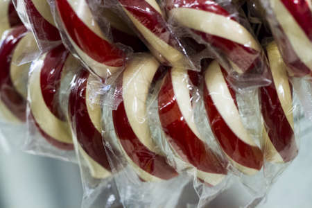 Rows of red and white striped candy canes and peppermint sticks stacked on top of each other