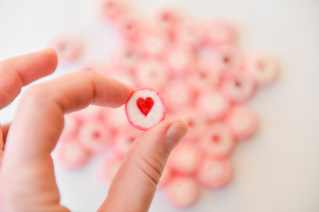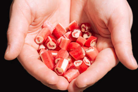 handful of handmade red chilli lollipops with pepper image in the hands of young girl. Macro