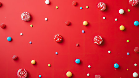 This image features an assortment of colorful candies arranged artistically on a bright red background, ideal for festive celebrations and dessert promotions.