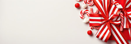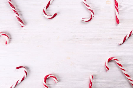 Christmas composition with candy canes, confetti and ribbon on white wood textured background. Top view, flat lay, copy space, new year treat.