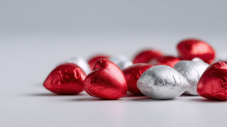 A delightful arrangement of heart-shaped chocolates wrapped in vibrant red and silver foil, creating a perfect treat for romantic occasions and sweet celebrations.