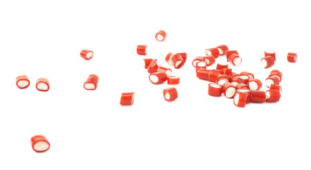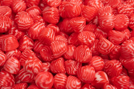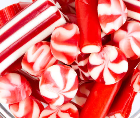 Multiple red and white candy sweets spilled over the white surface, composition isolated over the white background