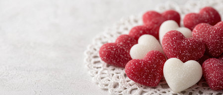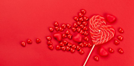 Valentines day with candy hearts over red background with copy space. Top view flat lay