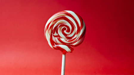 A red and white swirled lollipop against a vibrant red background, emphasizing its candy-like appearance.