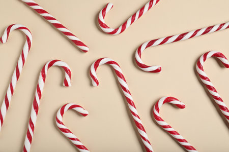 Merry Christmas and Happy New Year. Tasty candy canes on white background, flat lay. Space for text