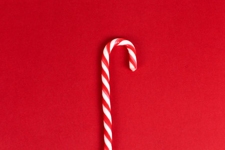 Red minimalistic christmas background with a candy cane top view with copy space.