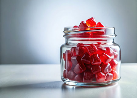Red Gummy Candies in Glass Jar on White Table - Sweet Treats Stock Photo