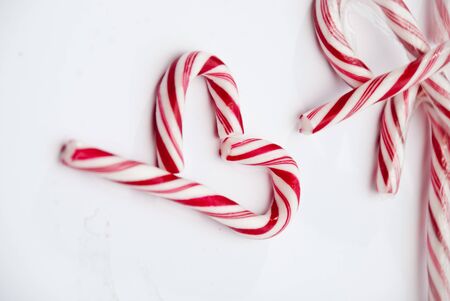 Heart shaped candy canes on a white background. Christmas concept with candy canes, copy space, place for text