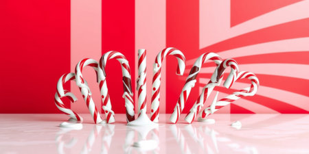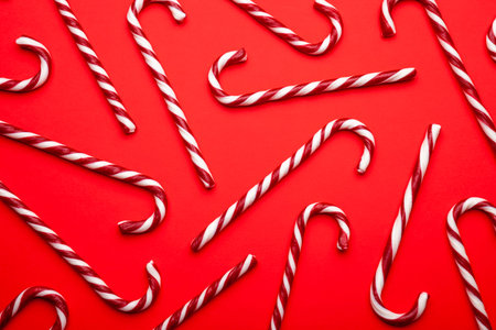 Beautifully arranged candy canes create a playful display on a vibrant red backdrop, perfect for holiday themes and festive celebrations.