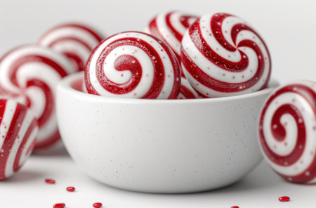 Bright red and white peppermint candies rest on a shimmering surface dusted with sugar, capturing the joy of festive celebrations and seasonal treats.
