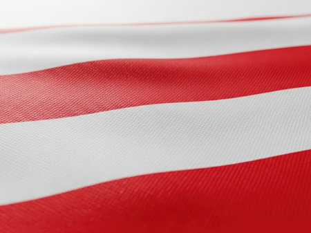 A detailed close-up view of a national flag in vibrant red and white colors, showcasing the unique textures and folds in the fabric, symbolizing pride.