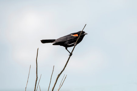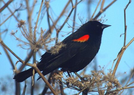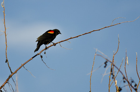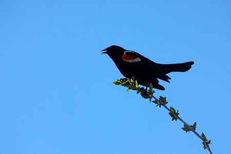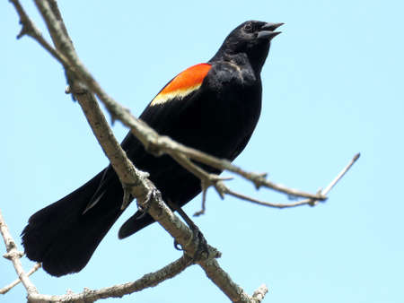 Red-winged blackbird perched on a branch against a blue sky on a summer day, taken from below