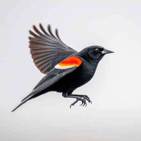 A blackbird is captured mid-flight against a simple, pale background, showcasing its extended wings. The bird exhibits striking red and yellow markings on its wing. The composition utilizes natural lighting, emphasizing the bird's form. This image could be suitable for various commercial or editorial applications.