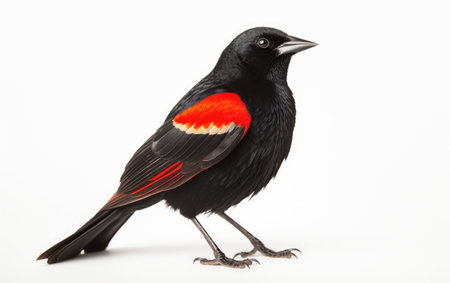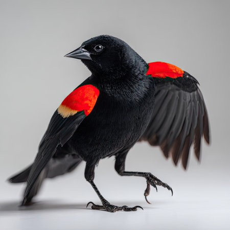 A striking black bird, captured mid-stride, showcasing vibrant red and yellow wing markings. The image highlights the bird's detailed feathers and sharp features. Set against a clean, neutral background, the lighting emphasizes the bird's form and color, suitable for various commercial applications.