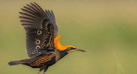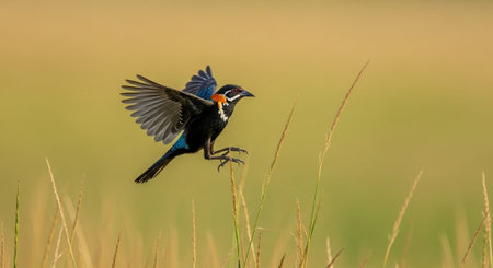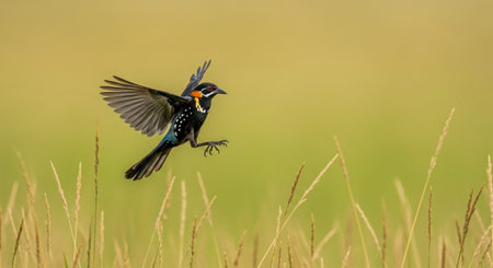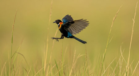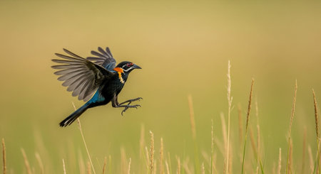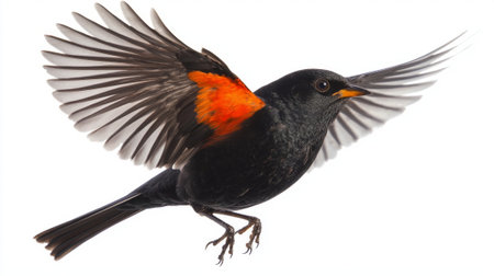 blackbird takes flight with its wings fully extended, highlighting its striking colors. The birds dynamic pose captures the essence of freedom and beauty in nature.