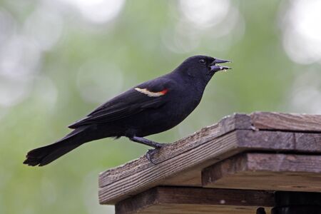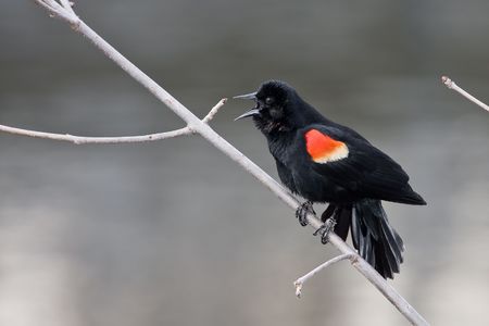A male Red-winged Blackbird (Agelaius phoeniceus) singing from a perch. Shot in Kitchener, Ontario, Canada.