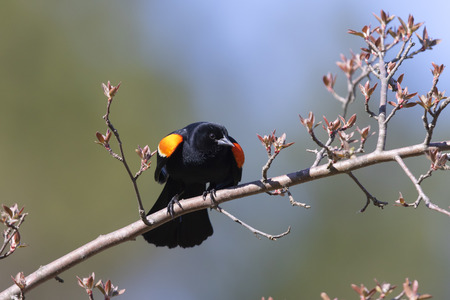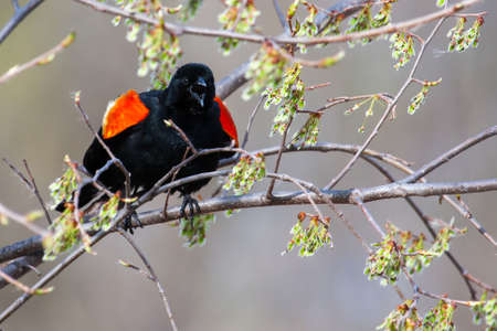Male Red-winged Blackbird (Agelaius phoeniceus) displaying its wing epaulets - Lambton Shores, Ontario, Canada