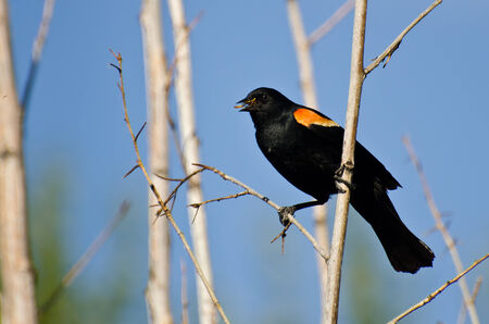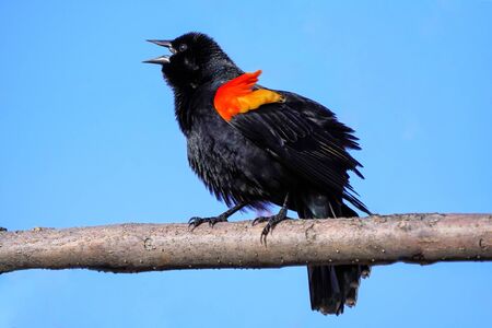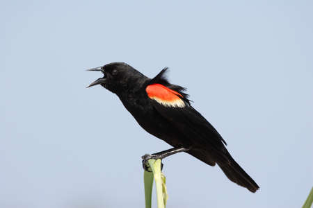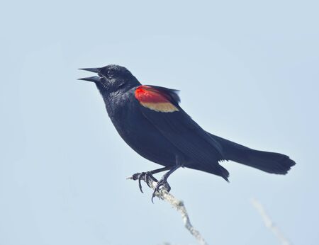Red-winged Blackbird (Agelaius phoeniceus) singing for a female during the spring.