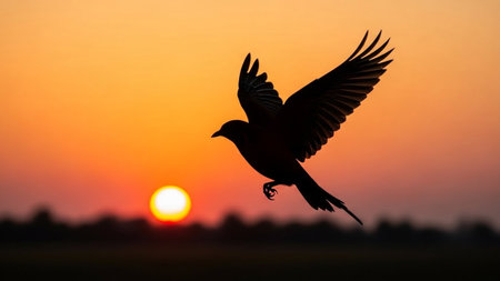 A stunning silhouette of a bird in flight caught against a golden sunset, showcasing the beauty of nature and the tranquility of the evening atmosphere.