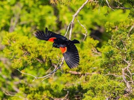 Close up shot of red-winged blackbird flying out at Oklahoma