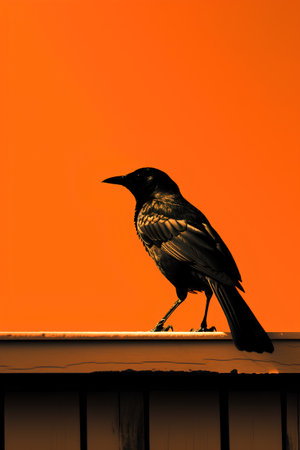 a small black bird perches on a wooden stem, surrounded by emotive fields of dark orange and gold. this captivating photo, captured with a c-mount lens by david nordahl, showcases the bird's dignified poses against a backdrop created with heavy use of palette knives. ai generated