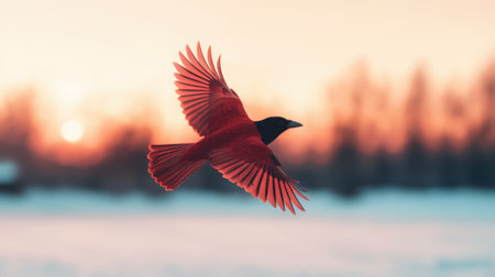 Vibrant Bird in Flight at Sunset Over a Snowy Landscape with Soft Pink and Orange Skies Reflecting Serenity and Beauty of Nature