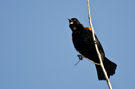 A vibrant Red-winged Blackbird perches and sings against a clear blue May sky in Waukesha County, Wisconsin.