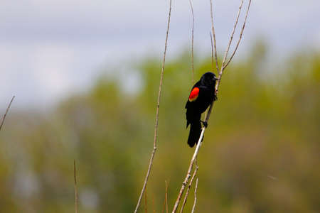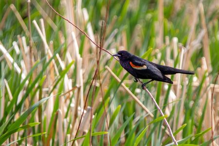 Red-winged Blackbird (Agelaius phoeniceus) perched on a reed in spring