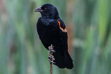A male Red-Winged Blackbird perched on plant stalk in a marsh in Calgary, Canada. These birds are common in North America and the male has all-black plumage save for his bright red and yellow wing epaulets.