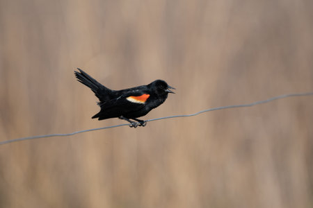 Red-winged Blackbird squawking on an electric wire in Quebec, Canada
