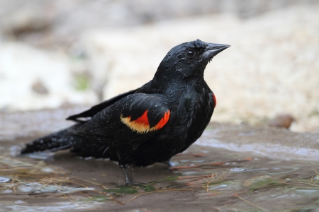 Male Red-winged Blackbird Agelaius phoenicius Bathing in a Shallow Pond