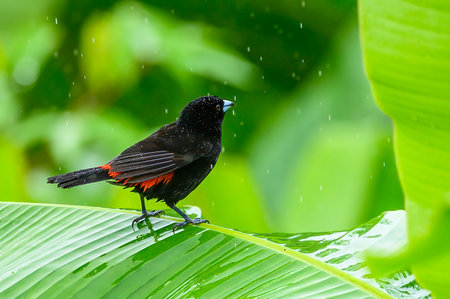 Black and red songbird Scarlet-rumped Tanager, Ramphocelus passerinii, exotic tropical bird form Costa Rica, in the green forest nature habitat.