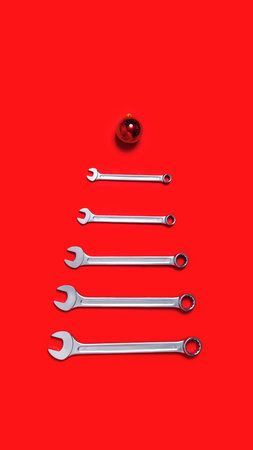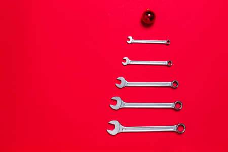 Christmas tree made of wrenches decorated with balls on a red background. New Year banner with tools. Postcard with place for greeting text for happy new year with industrial holiday concept. Close-up